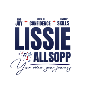 Text graphic with the words: "Find joy, grow in confidence, develop skills. Lizzie Allsopp. Your voice, your journey," adorned with musical notes and stars.